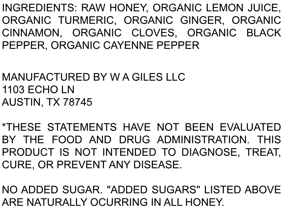 Raw Honey, Organic Turmeric, Ginger, Cinnamon, Cloves, Black Pepper, and a pinch of Cayenne.